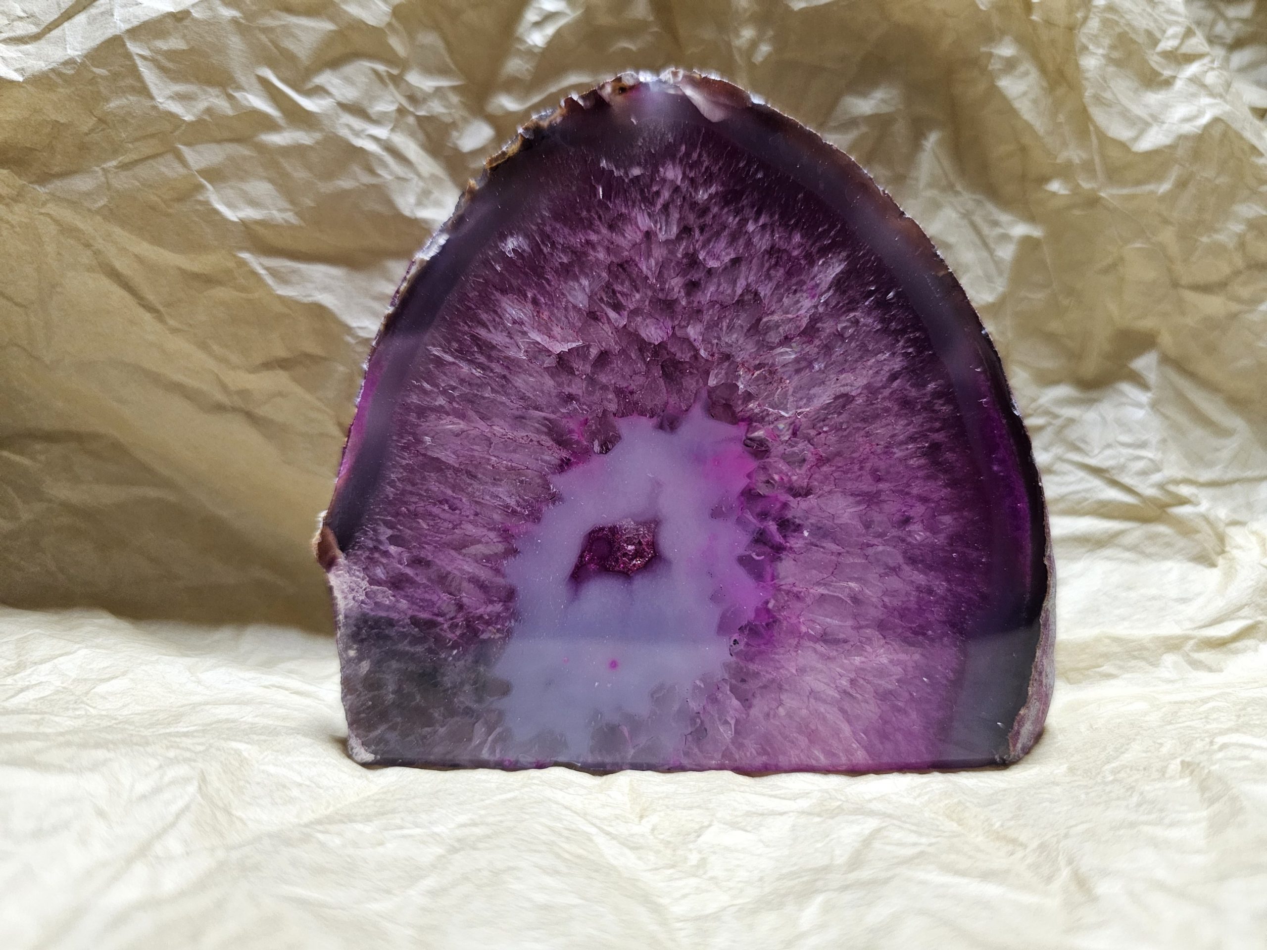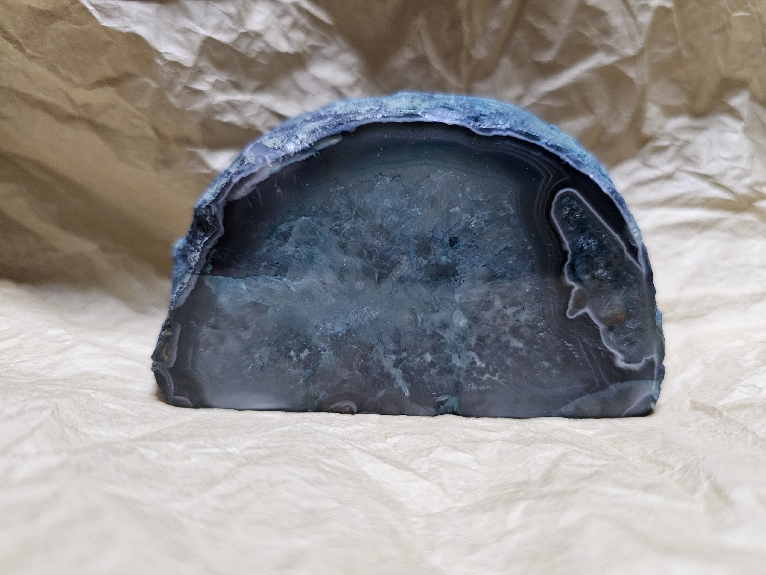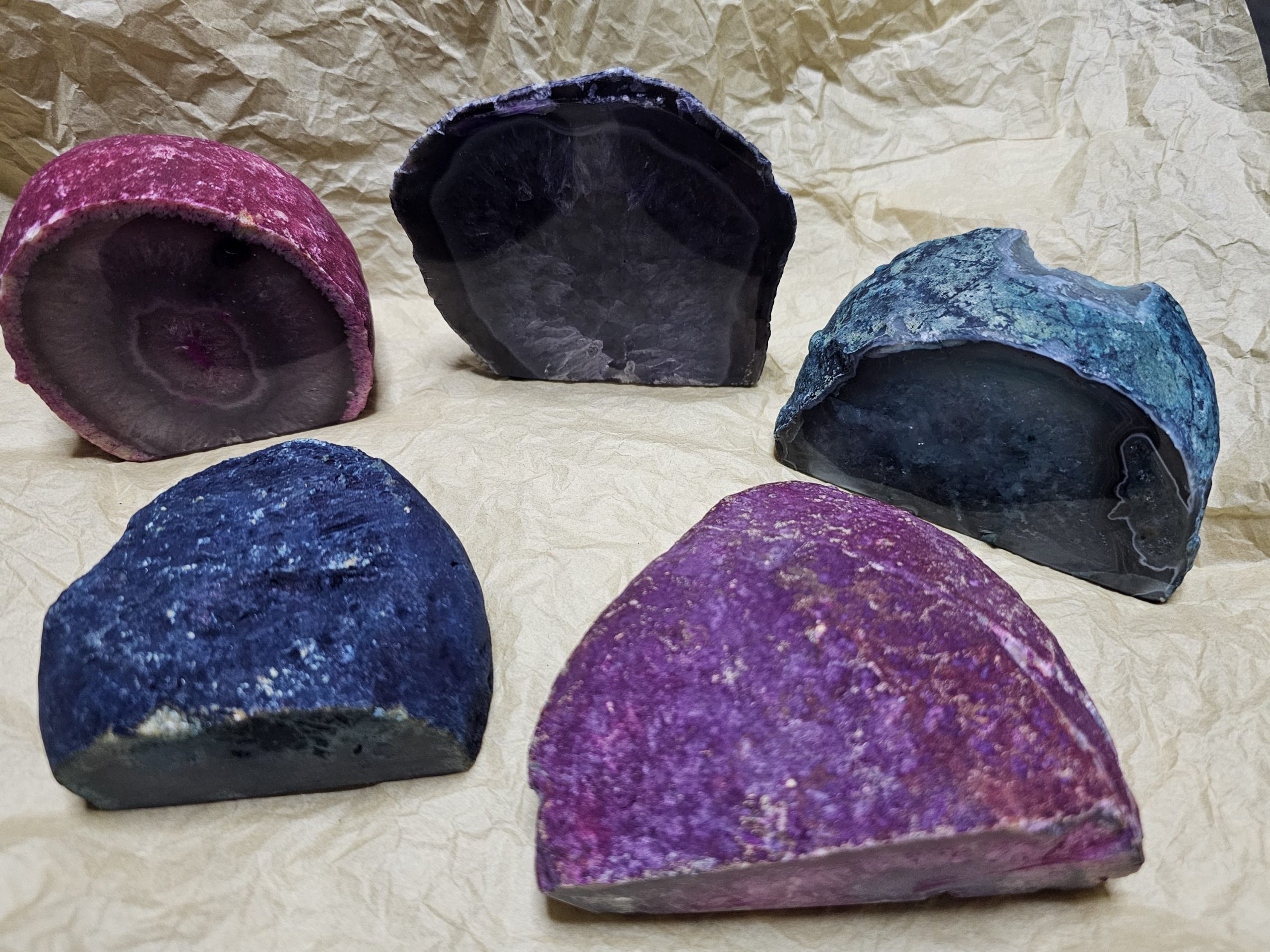 Diese schönen brasilianischen Achat Geoden wurden gefärbt, geschnitten und auf einer Seite poliert, um die feinen Bänderungen und Strukturen besonders hervorzuheben. Teilweise mit Kristalldruse, teilweise ohne. Die Rückseite ist abgesehen von der Farbe naturbelassen.
