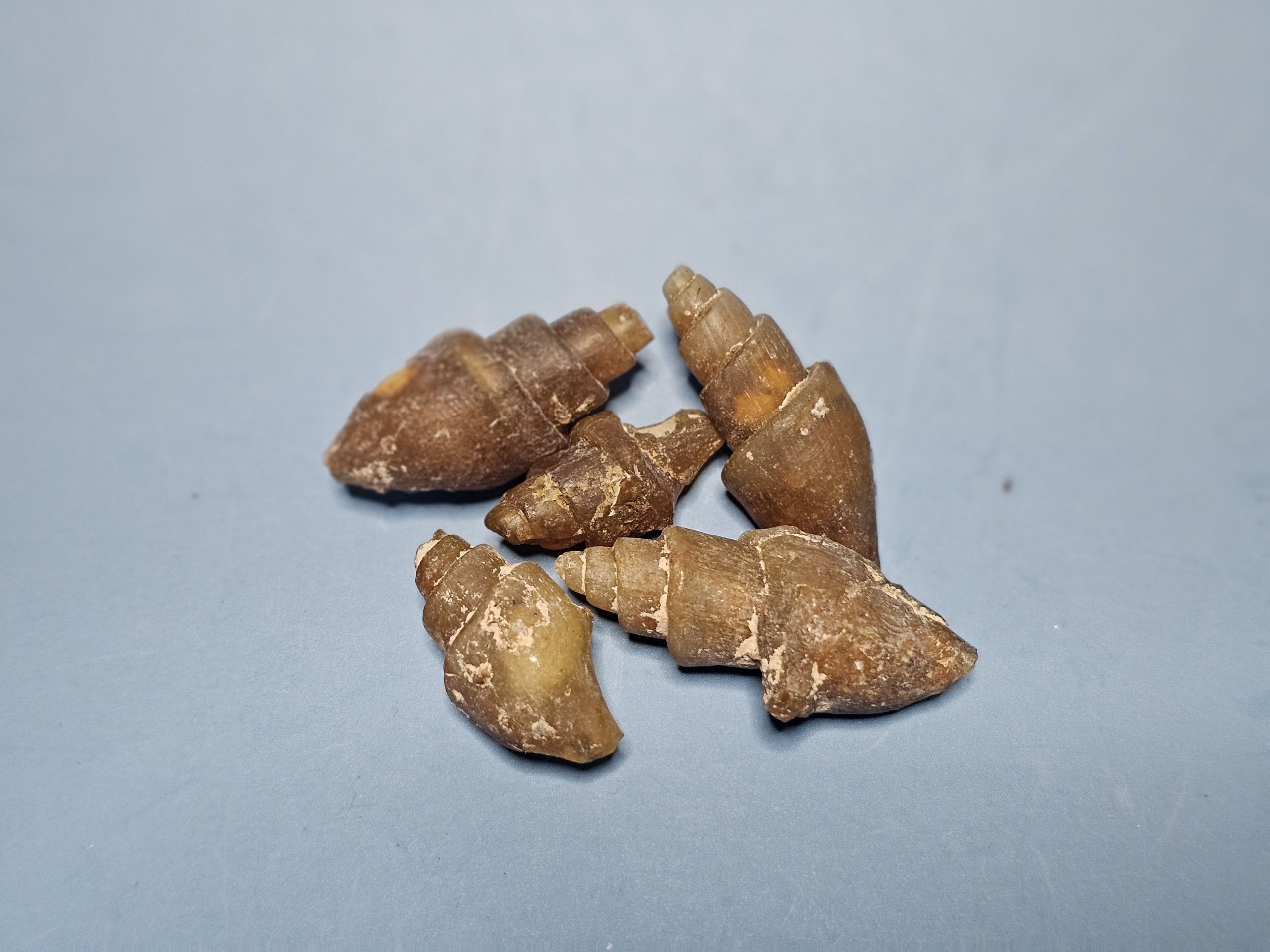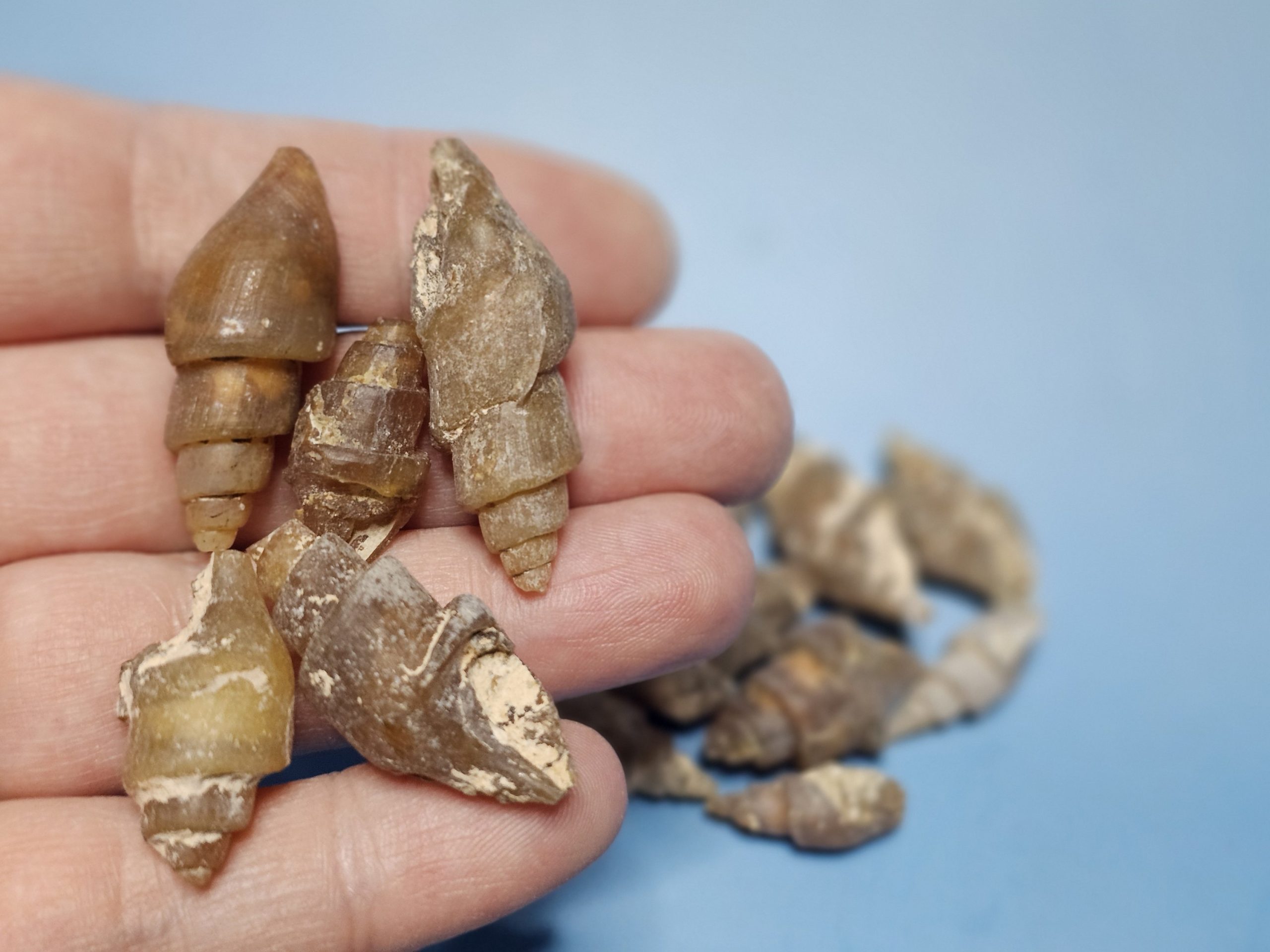 Diese Fossilien stammen von Turritellen, Meeresschnecken, die vor mehreren Millionen Jahren in der späten Jurazeit lebten. Ihre Fossilien zeigen die typischen, langen, spiralförmigen Schneckenhäuser aus vielen feinen Windungen. Turritellen leben im Sand oder Schlamm auf dem Meeresboden und ernähren sich von kleinen Partikeln im Wasser. Spannend: die Fossilien zeigen, das sich diese Tiere über Millionen Jahre kaum verändert haben. Sie sehen also heute noch genauso aus wie früher zu Zeiten der Dinosaurier. Jedes Fossil ist einzigartig in Form, Farbe und Größe.
