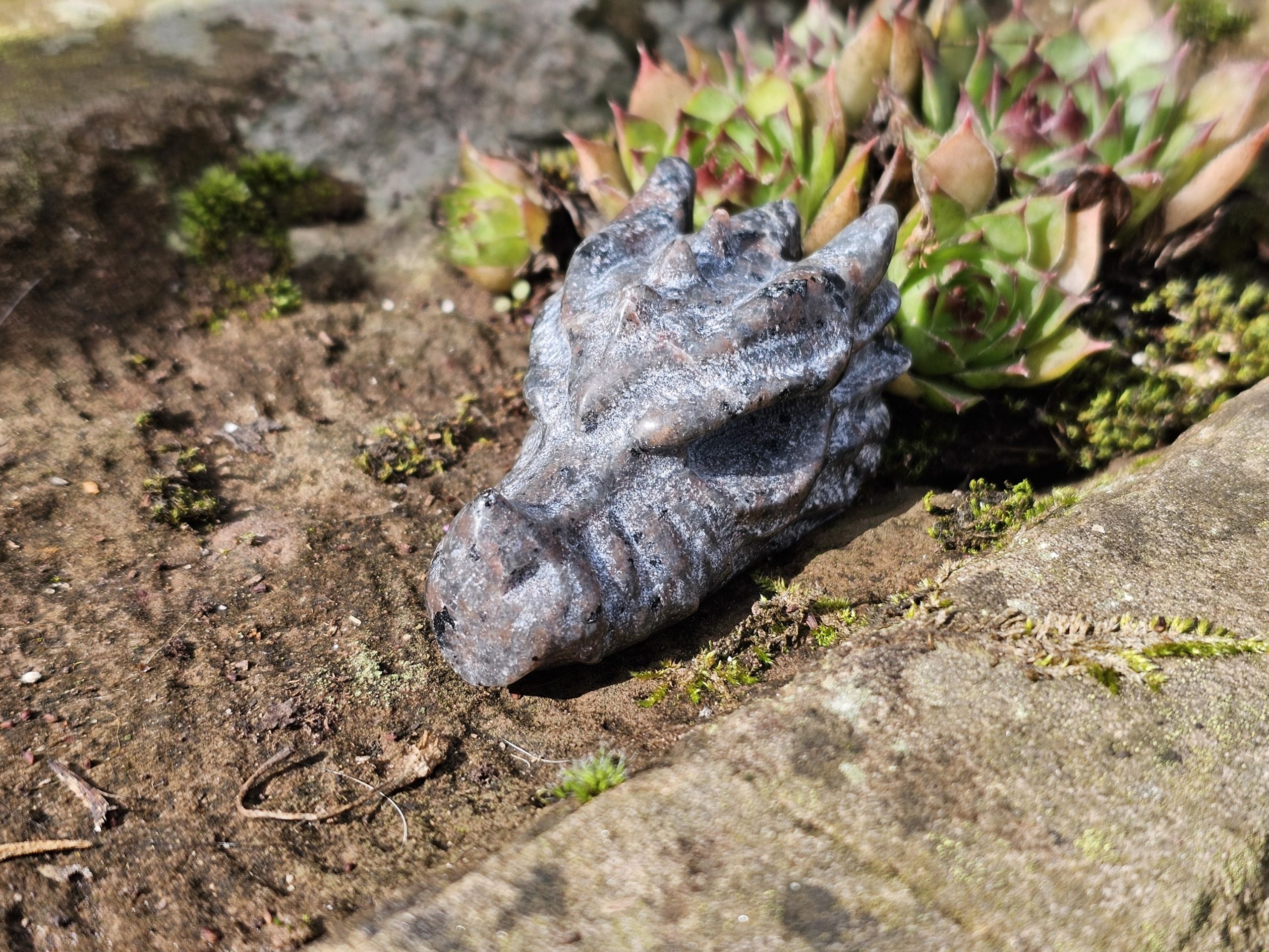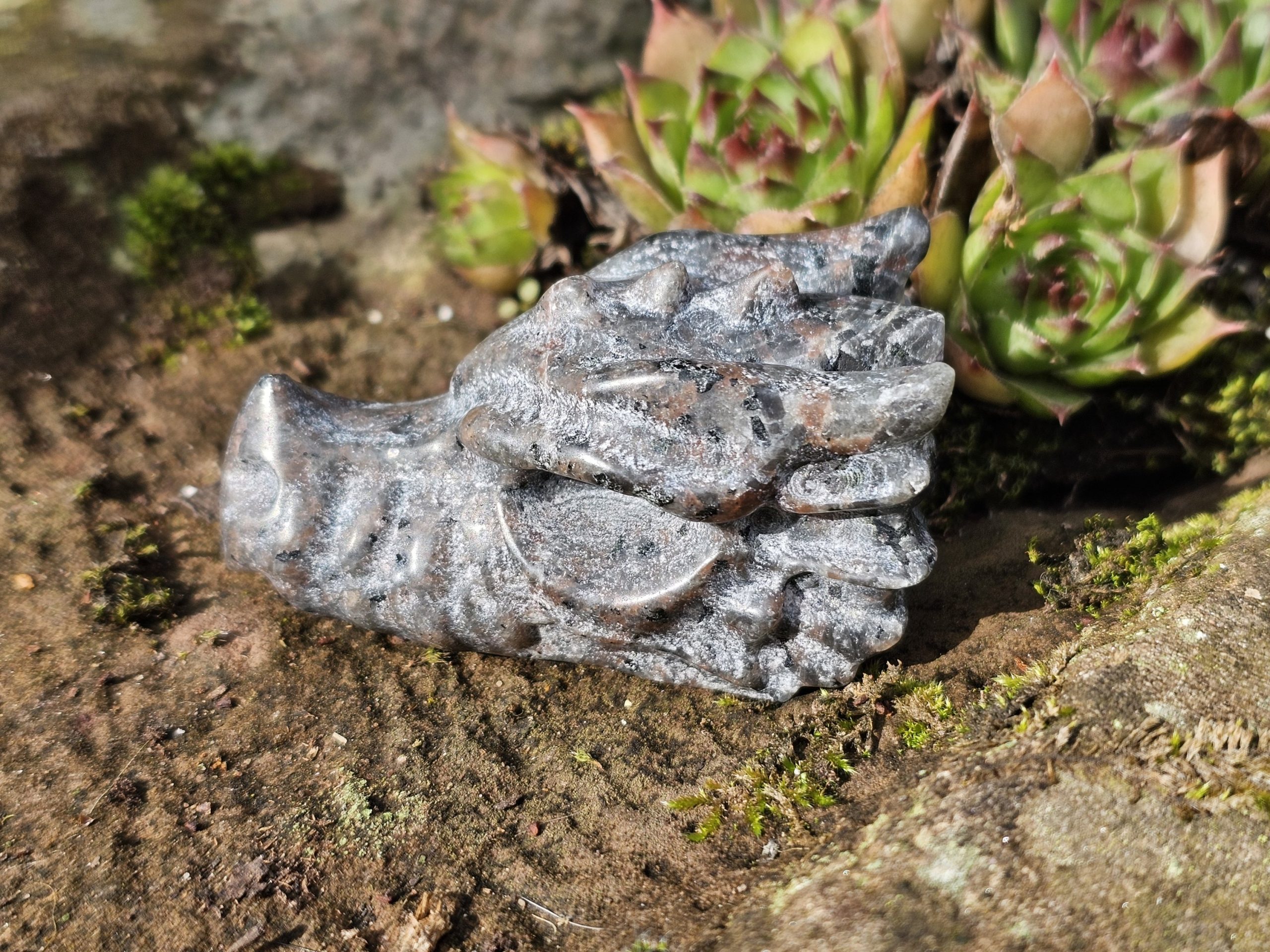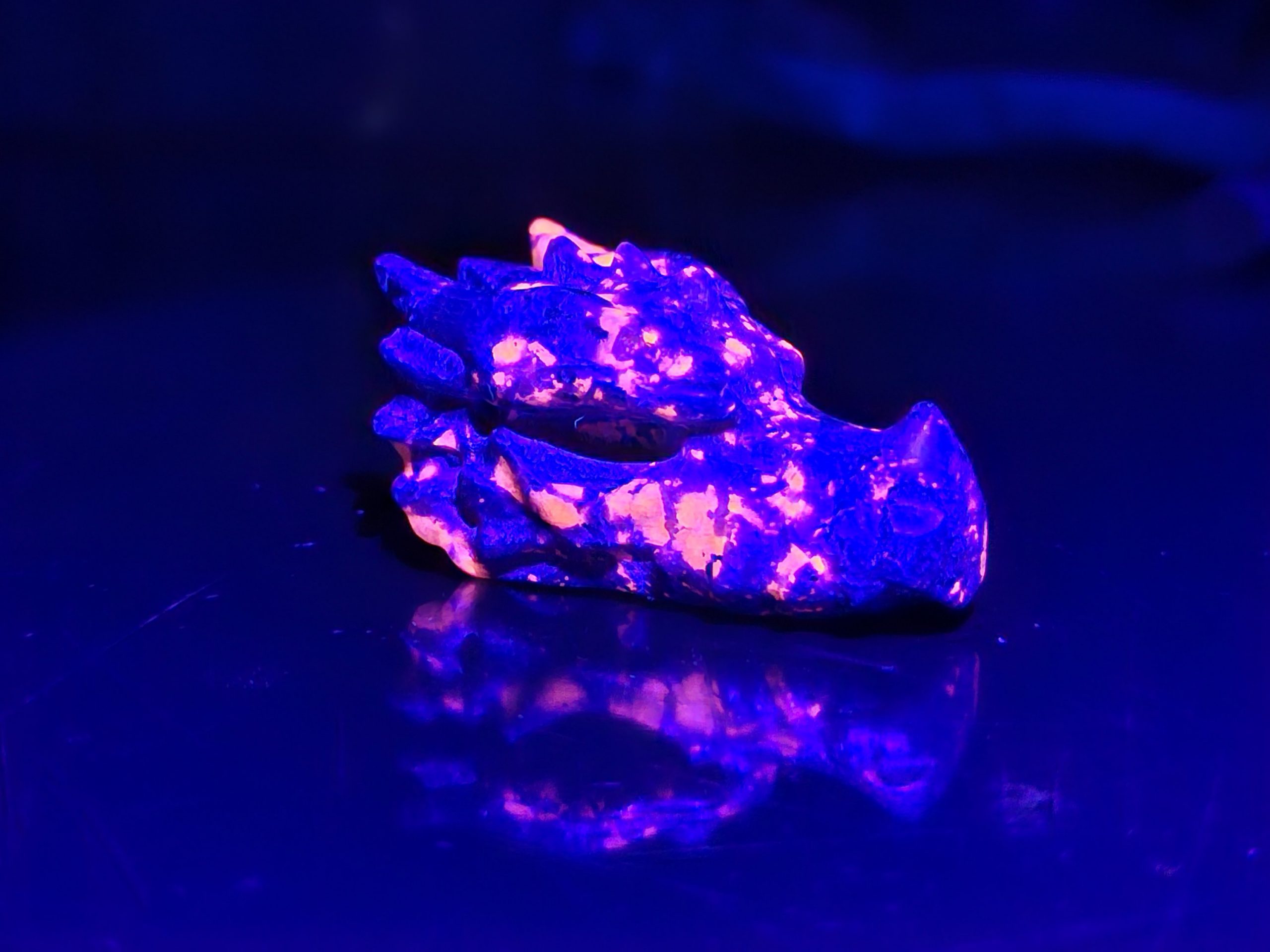 Dieser beeindruckende Drachenkopf wurde aus fluoreszierendem Syenit-Gestein mit Sodalit-Anteilen gefertigt, welches auch Yooperlite oder Flammenstein genannt wird.