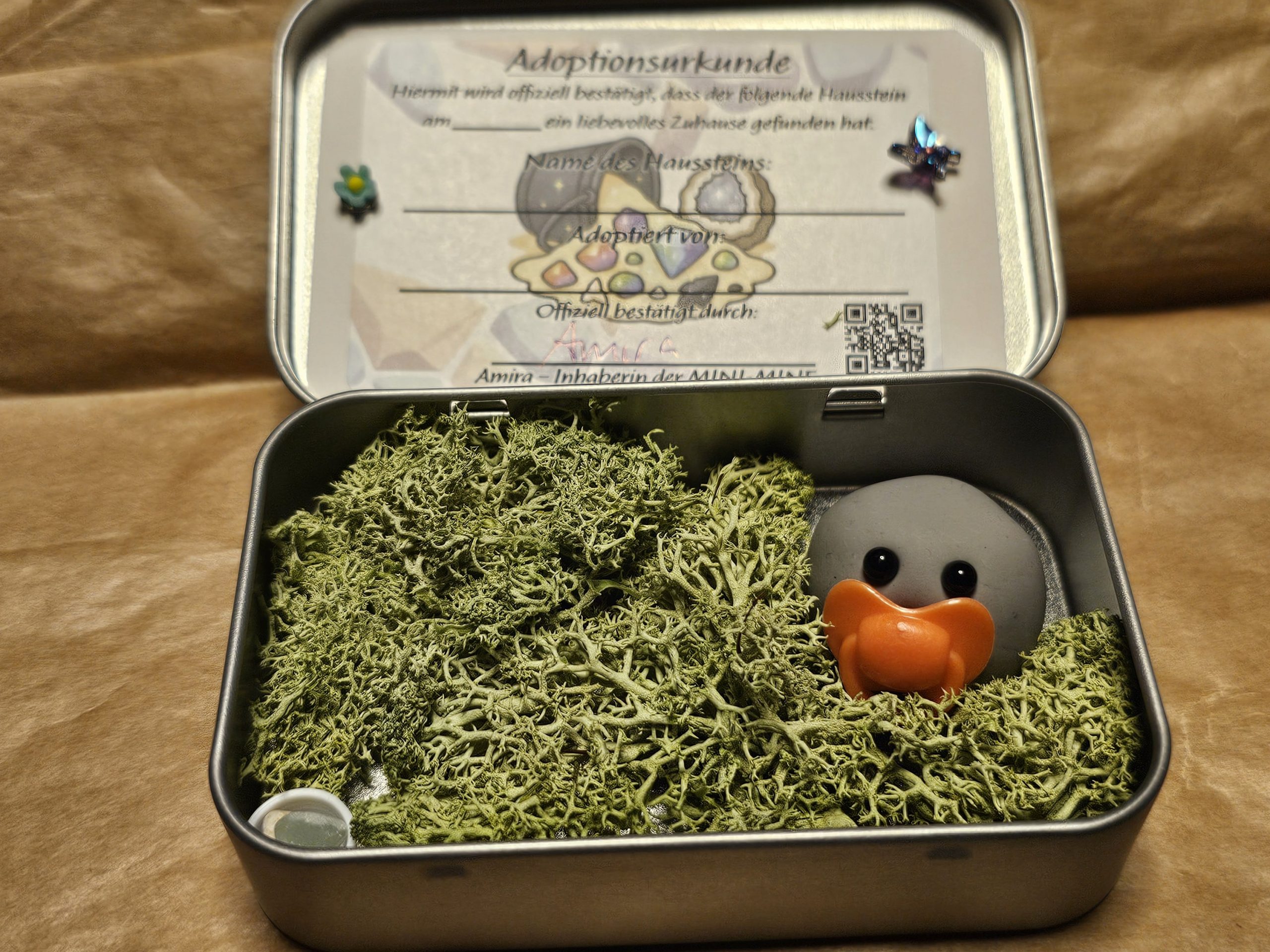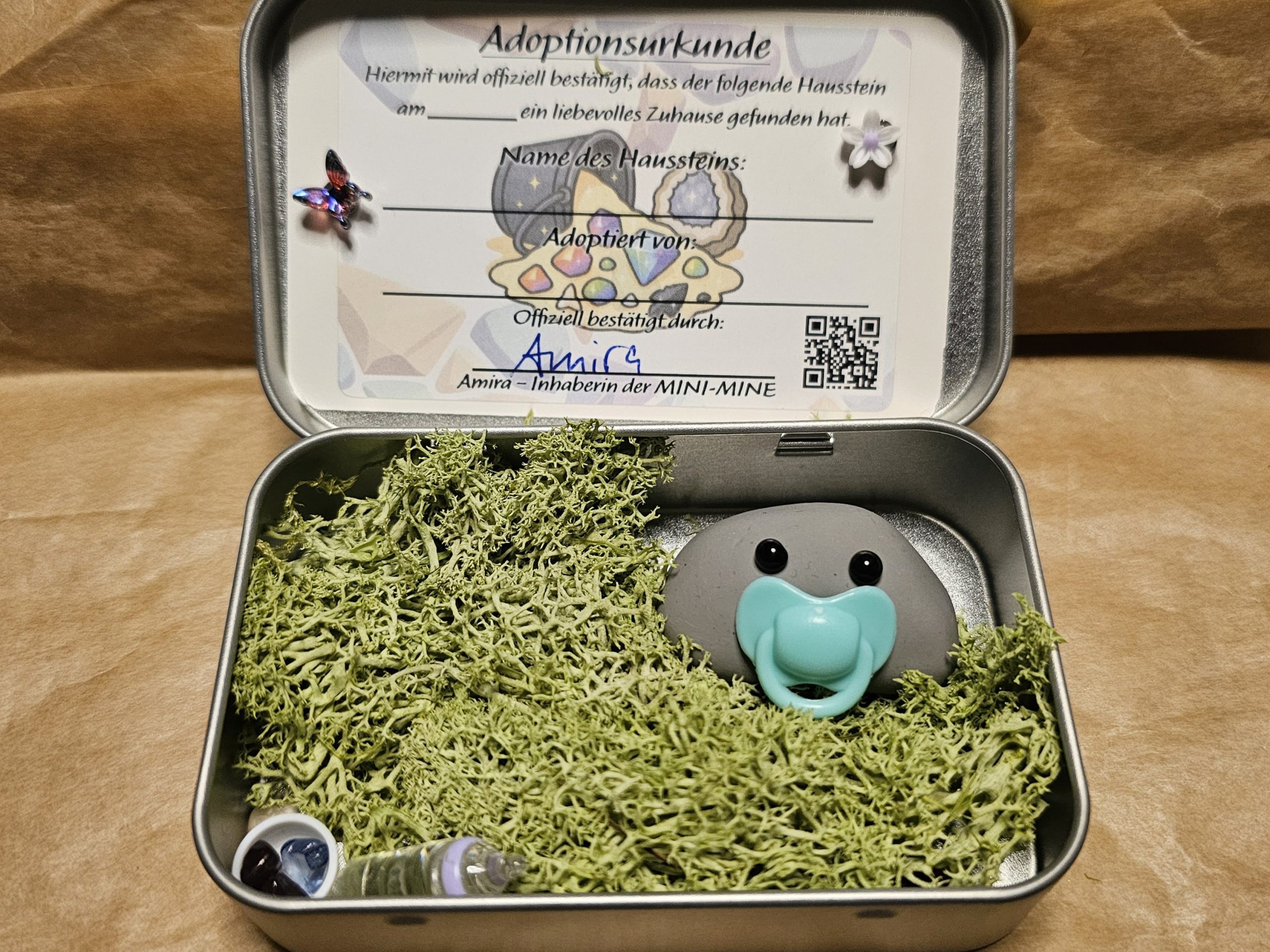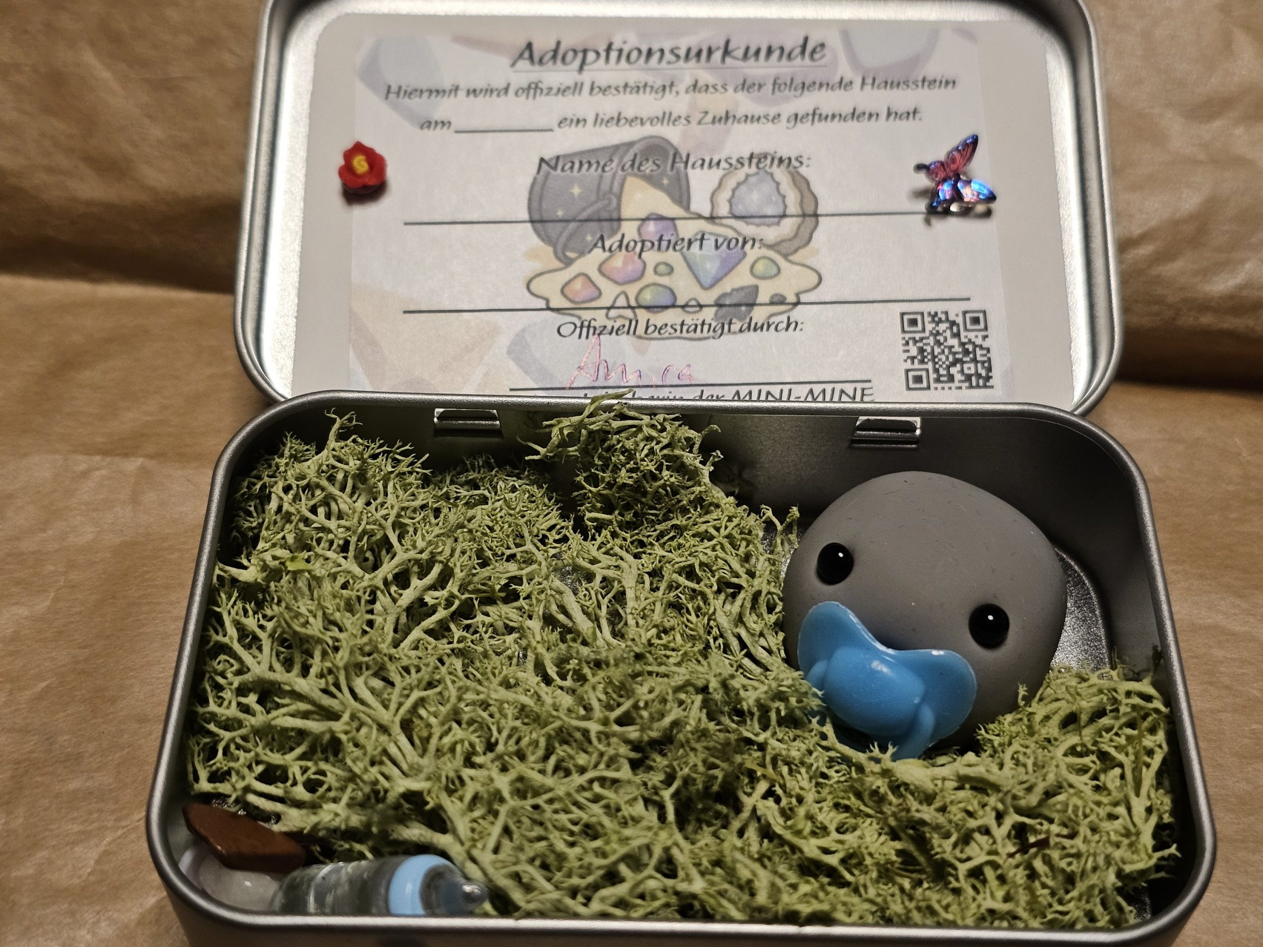 Jedes Kieselchen kommt mit einer Adoptionsurkunde die ausgefüllt werden muss um die Adoption offiziell zu machen. Außerdem ist eine Karte zum freirubbeln dabei, auf der sich der Name des Haussteins verbirgt.