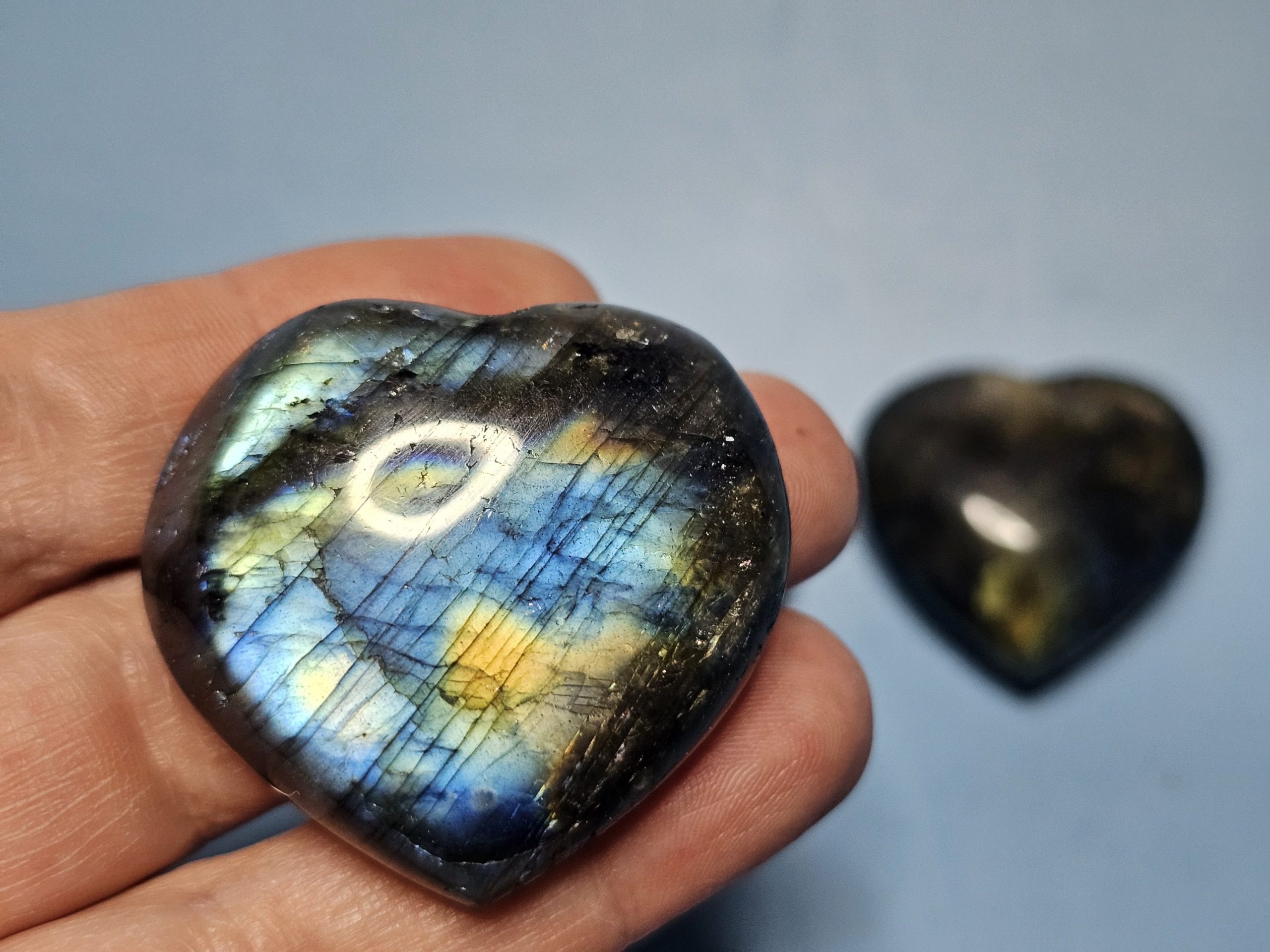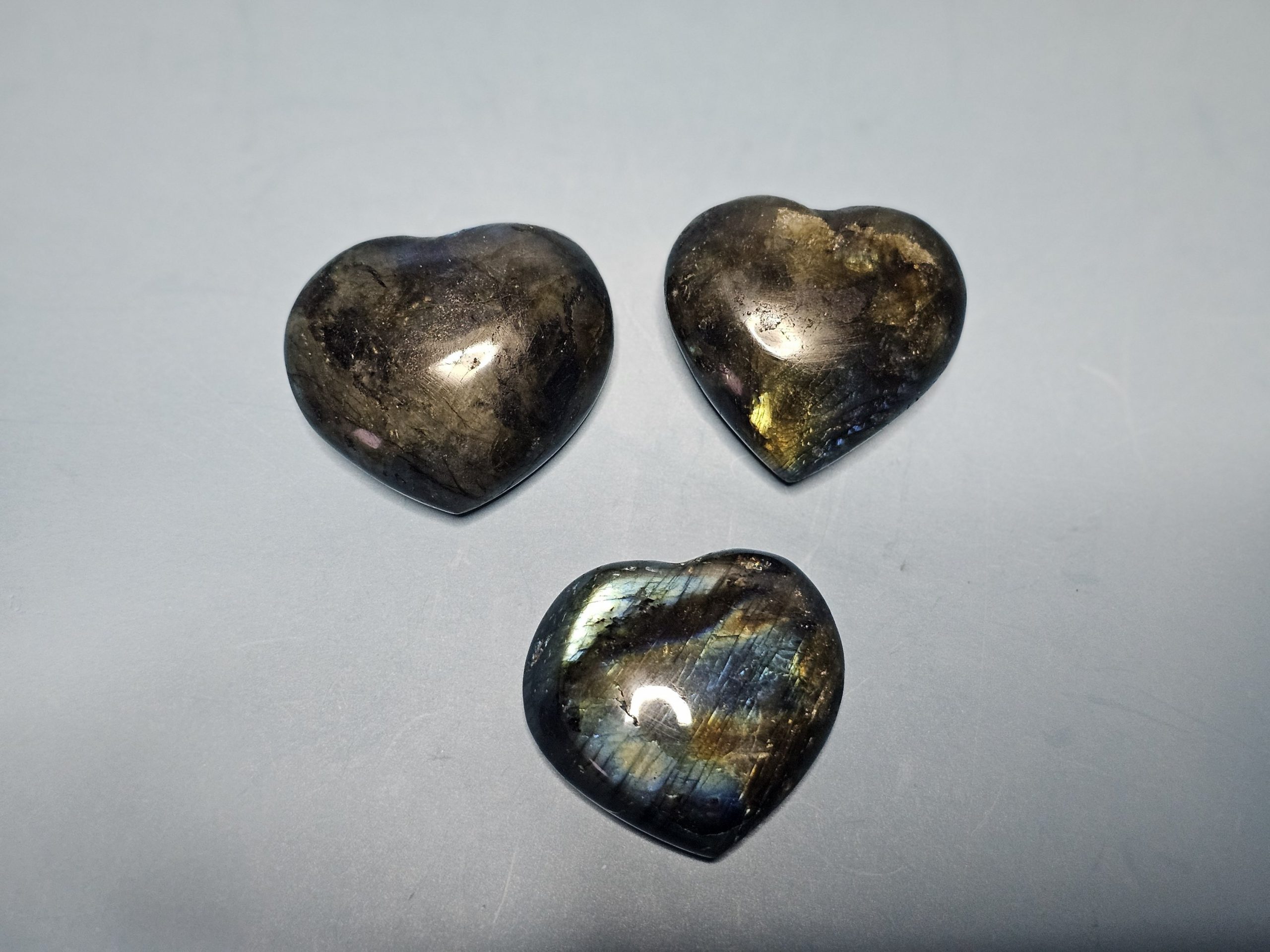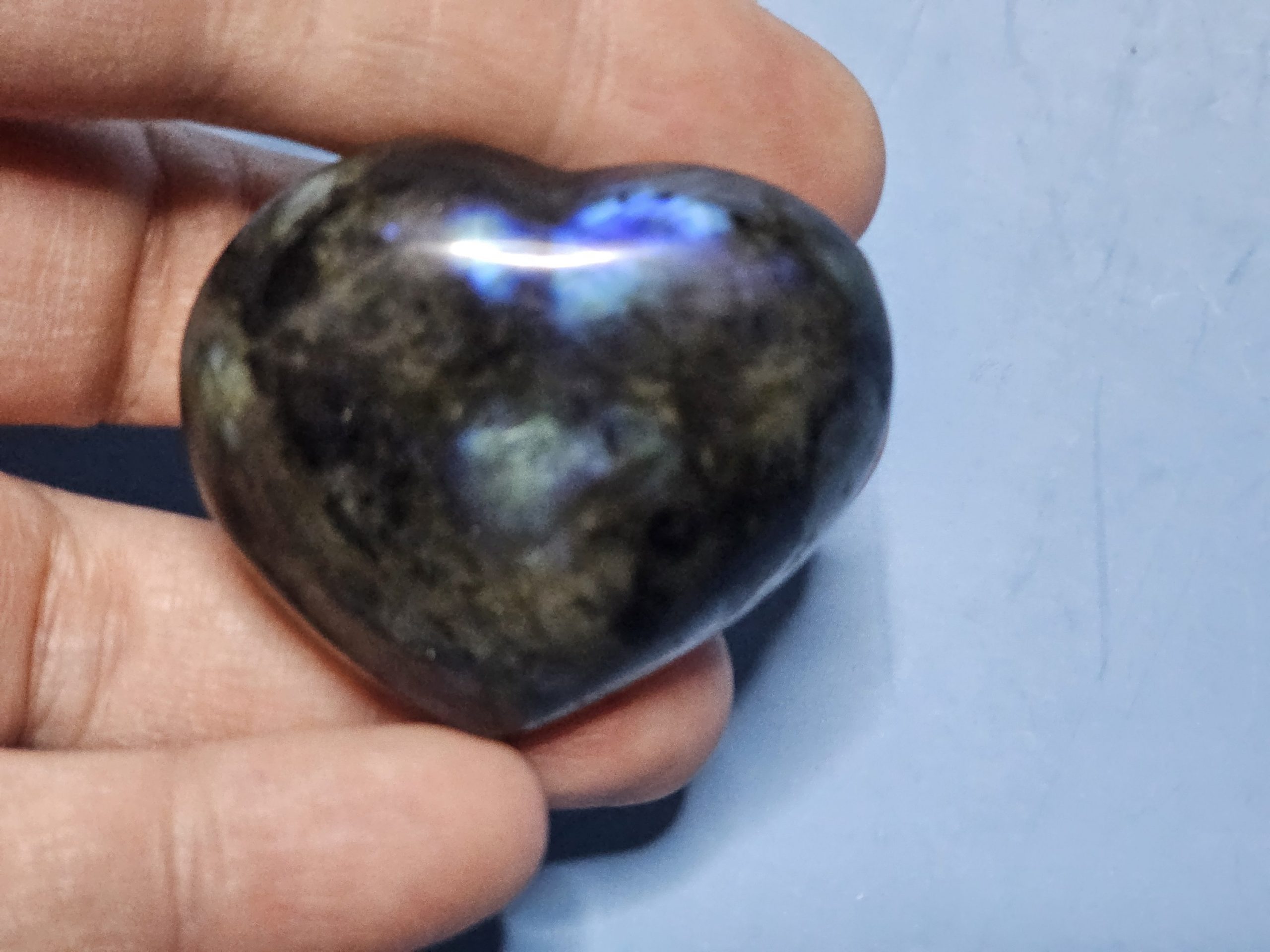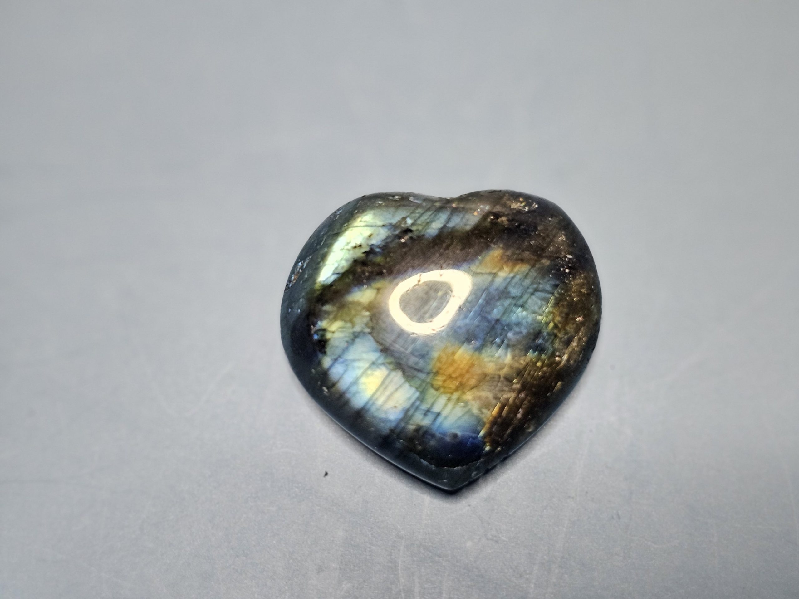 Herzförmig geschliffener Labradorit mit natürlicher Labradoreszenz. Je nach Lichteinfall zeigt der Stein seine typischen Farbreflexe. Jeder Herzstein ist ein Unikat. Ideal als Geschenk, Handschmeichler oder dekoratives Sammlerstück. Ca. 3,5 – 5 cm