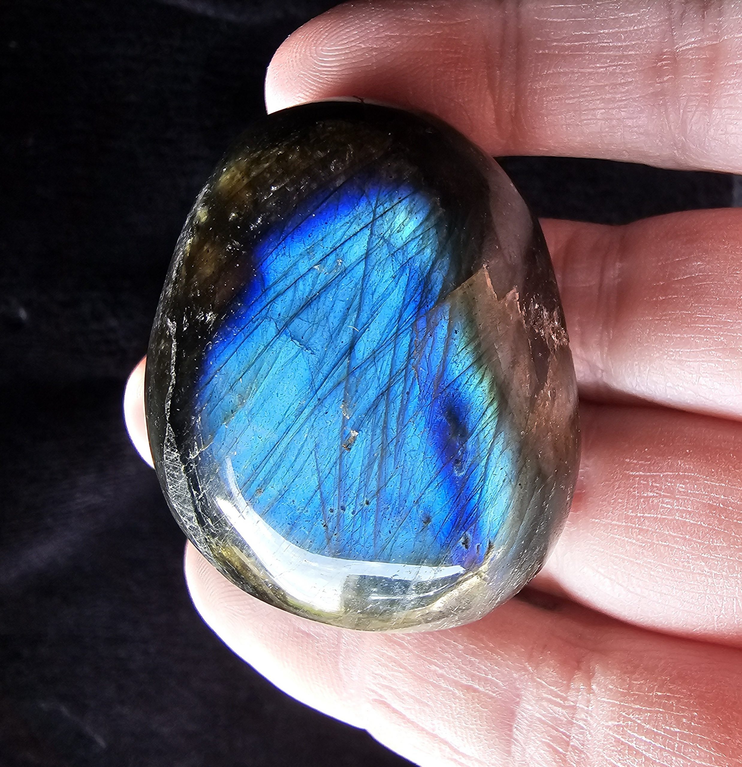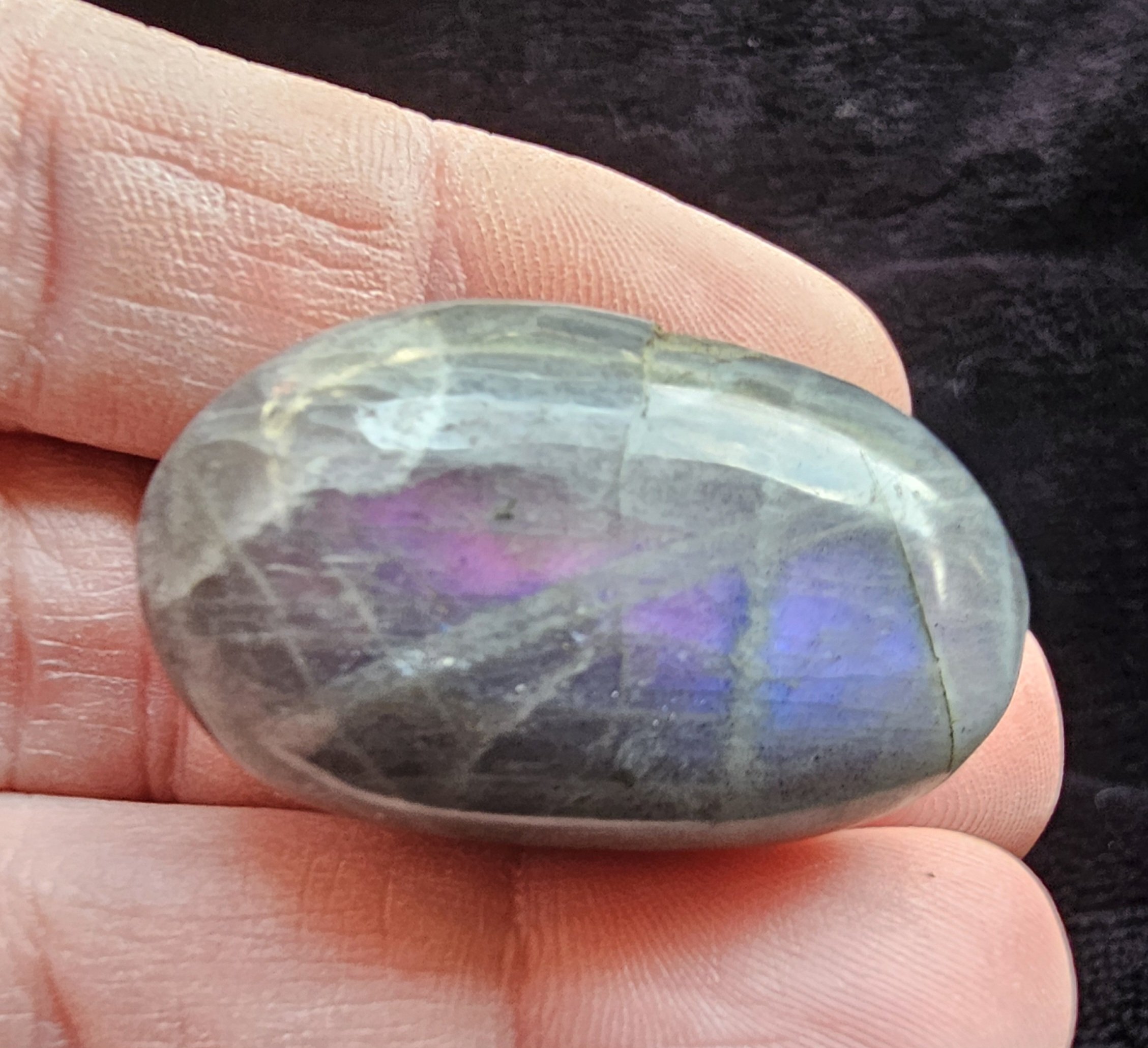 Schöne, von Hand geschliffene und polierte Taschensteine aus Labradorit. Jeder hat eine individuelle Labradoreszenz. Perfekt als kleiner Glücksbringer oder Fidgetstein für die Hosentasche. Zufälliger Stein, weicht vom Foto ab