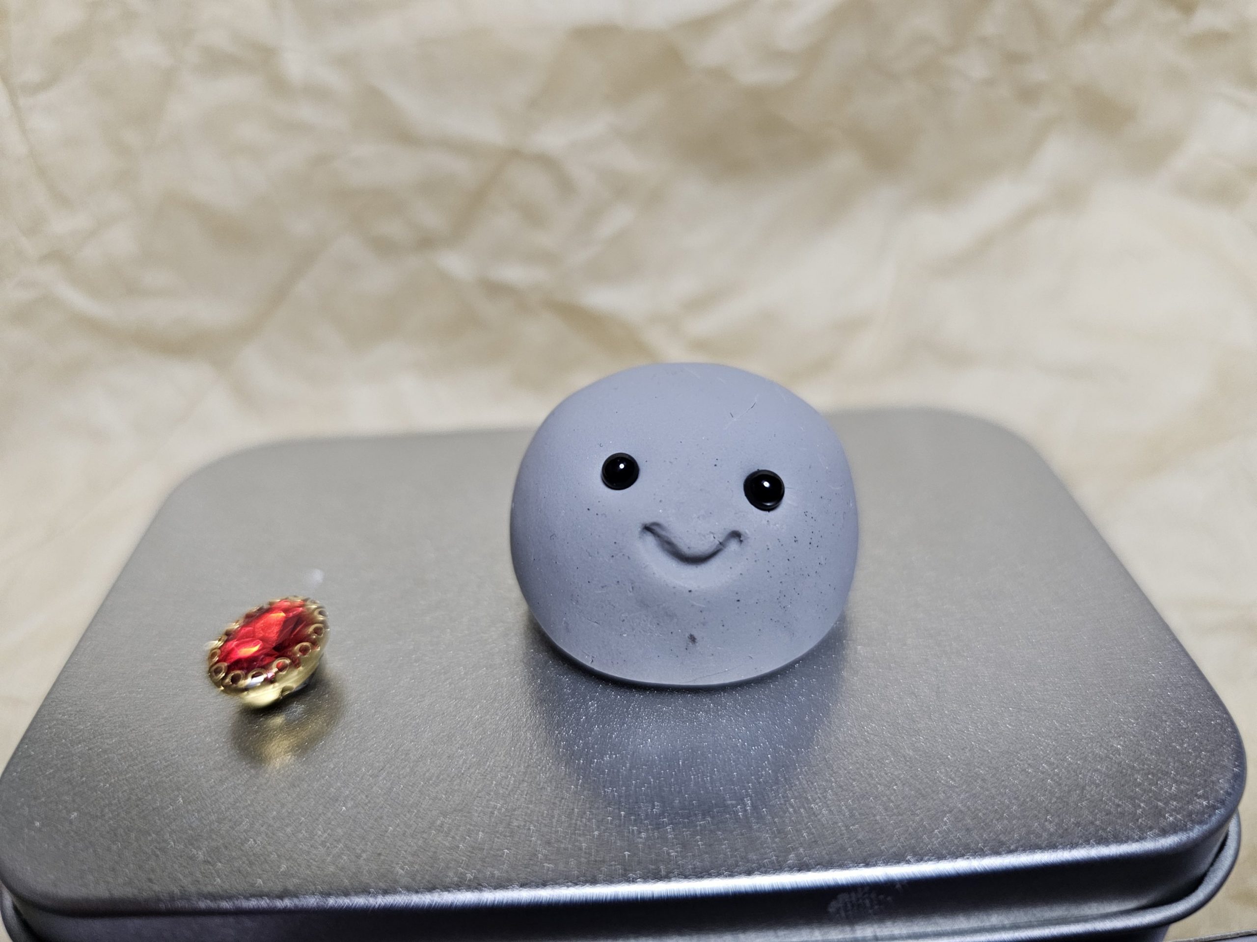 Diese schöne Kiesel Dame ist ein Unikat und bringt ihr eigenes kleines Zuhause mit: eine gemütliche Metalldose, etwas Moos als kuscheliges Bett, kleine Edelsteine als Snacks, ein „Juwel“ und einen Napf zum Essen, alles was ein liebreizender Stein braucht.