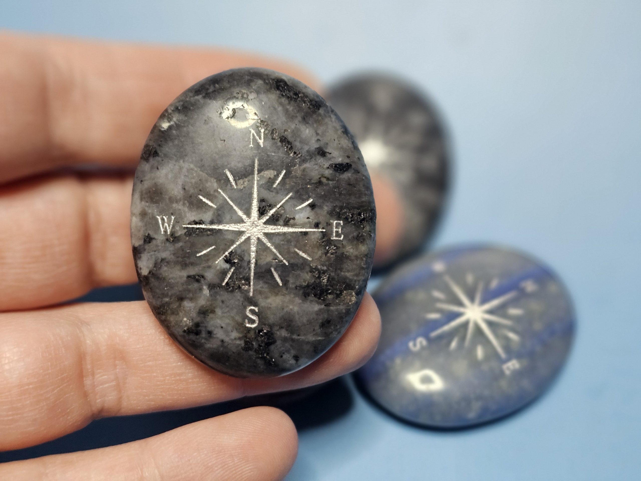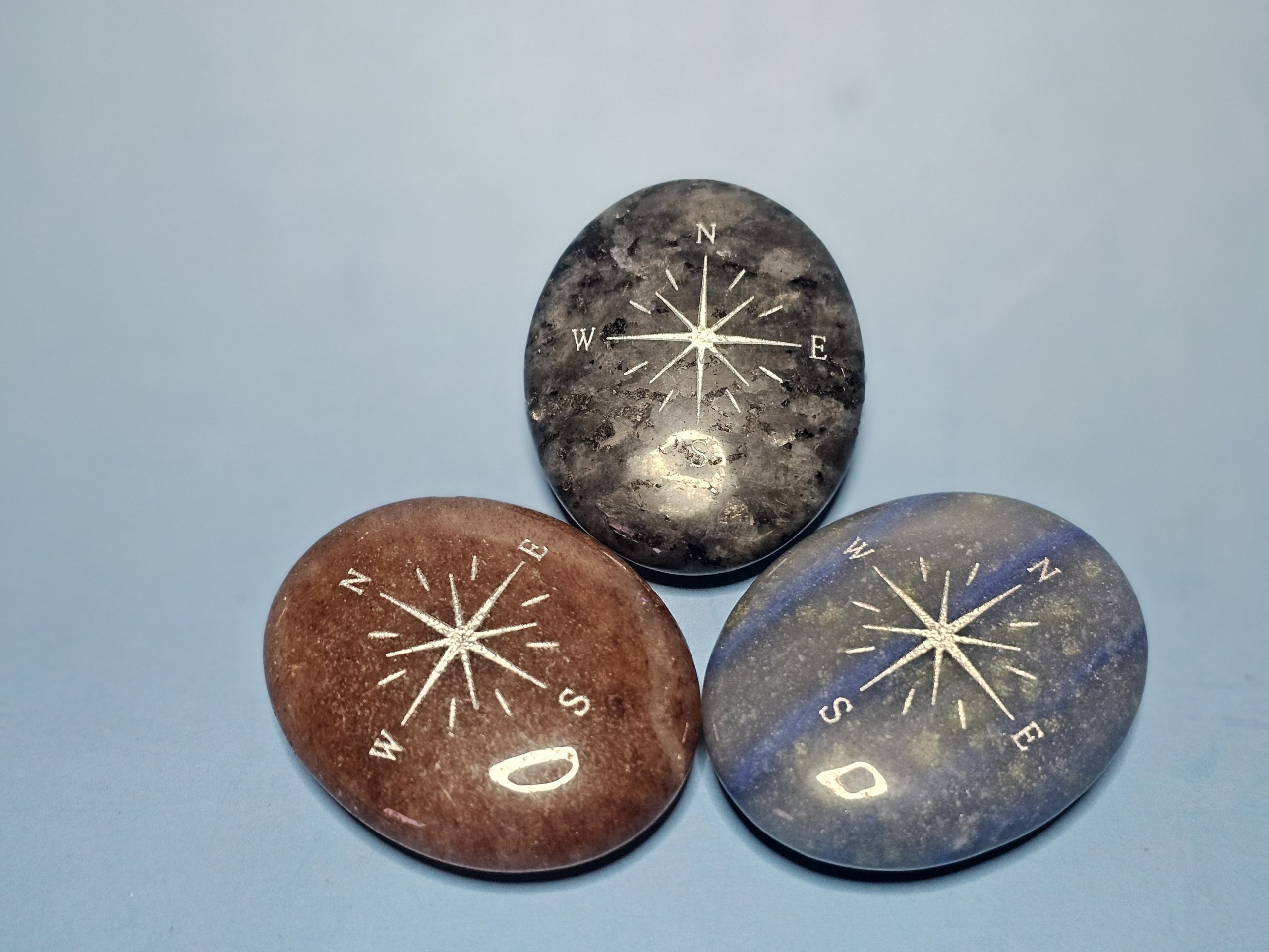 Ein Glatt geschliffener Edelstein mit eingravierten Himmelsrichtungen. Der Stein liegt angenehm in der Hand und passt gut in die Hosentasche. Die Gravur macht ihn zu einem kleinen Symbol für Richtung, Weg und Fokus. Jeder Taschenstein ist ein Unikat: Form, Farbe und Maserung variieren naturbedingt. Edelsteinsorte zufällig (Wünsche werden wenn möglich berücksichtigt).