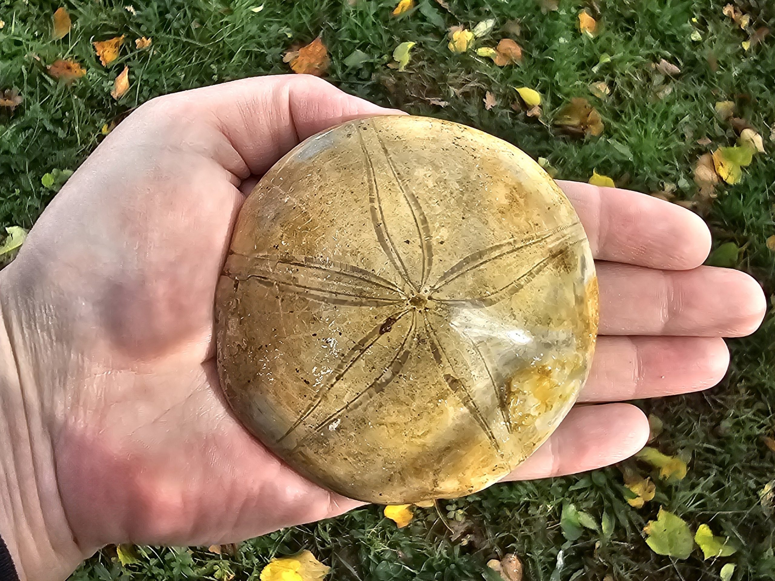 Die Sanddollar, von denen diese Fossilien stammen, lebten vor Millionen Jahren in warmen, flachen Meeren 🌊. Sie gehören zur Familie der Seeigel und haben keine Stacheln mehr, sondern eine flache, runde Schale – fast wie eine Münze aus Kalk. Daher kommt auch ihr Name: Sanddollar.