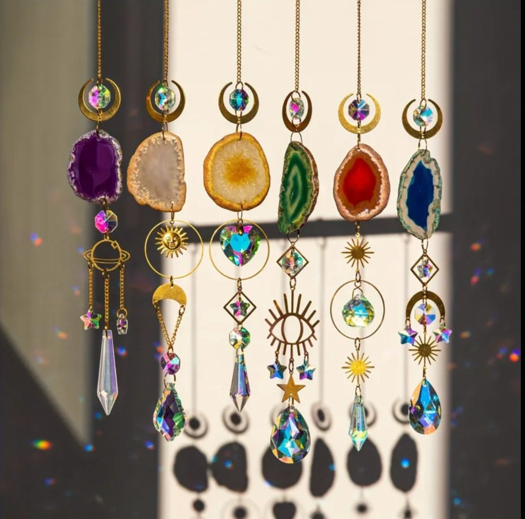 Sonnenfänger (mit Aufhänger) mit einer geschliffenen und gefärbten Achatscheibe. Jede Scheibe ist ein Unikat mit individueller Struktur. Bei direktem Lichteinfall entstehen wunderschöne bunte Lichtreflexe. Mini Regenbögen die jedes Zimmer strahlen lassen.
